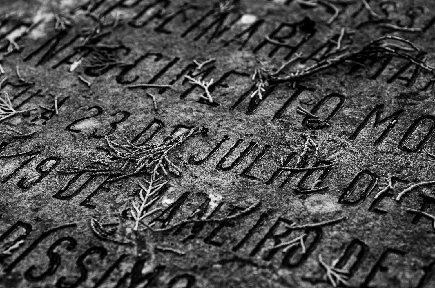 A black and white photograph of a weathered wall with a religious mural of a veiled woman holding a crying face, possibly depicting Mary with the Christ child, and the letter 'C' carved or painted on the wall.